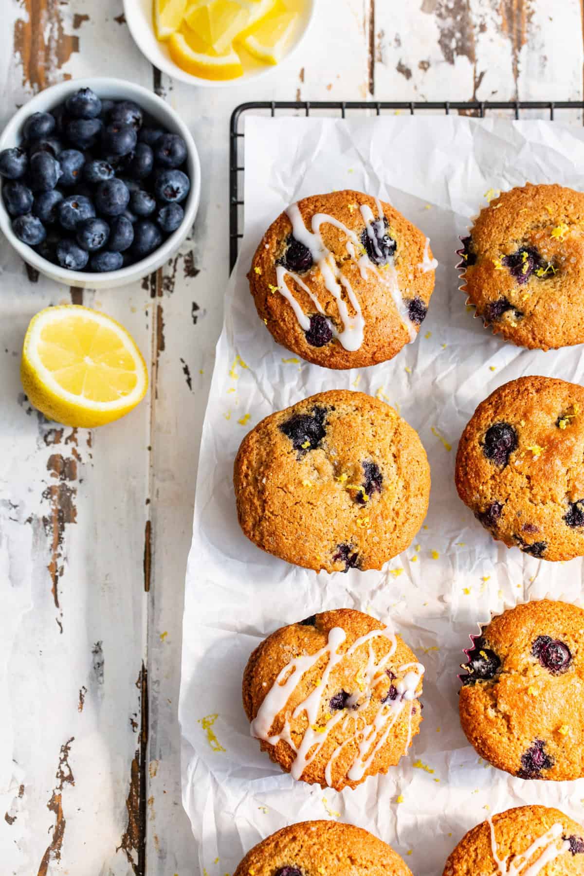 - If glazing the muffins, make the glaze while the muffins cool. Drizzle the glaze over the partially cooled, or fully cooled muffins, and allow 15 minutes for the glaze to set. Garnish with extra lemon zest if desired.