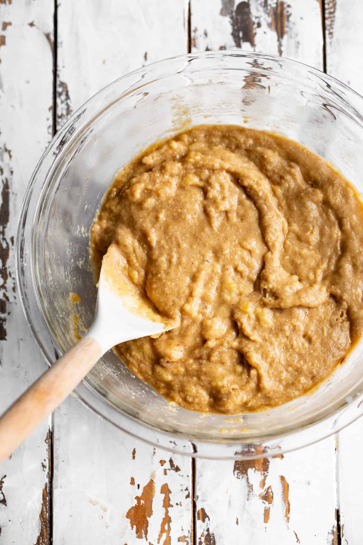 - In a large bowl, whisk together the mashed bananas with the eggs, then stir in the maple sugar, coconut oil and vanilla until well combined.