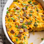 This chicken sausage hash brown breakfast casserole is a savory breakfast dream! It’s easy to throw together and great to prep ahead of time. Grain free and dairy free, family approved and awesome as breakfast for dinner!