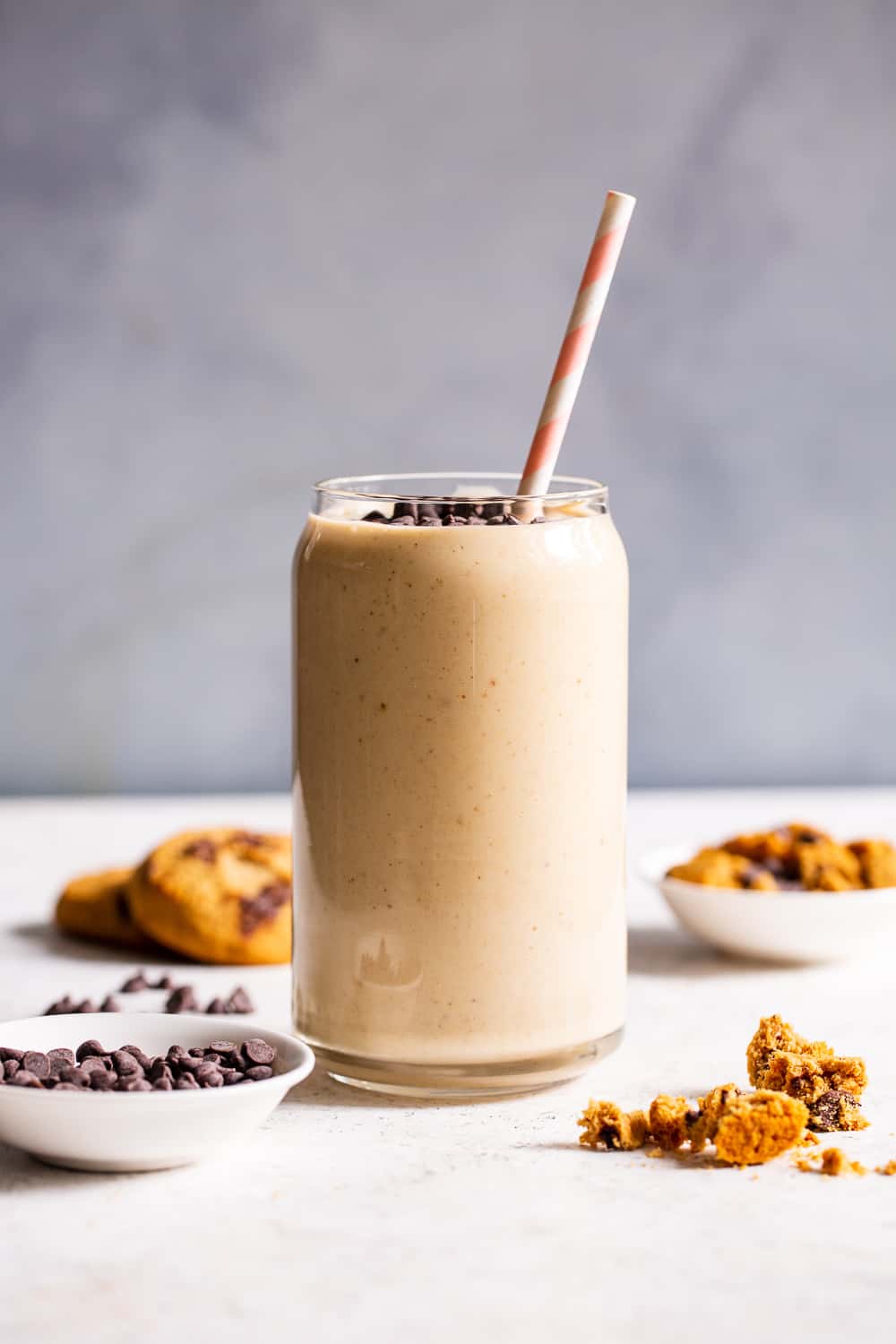 Today we’re making a chocolate chip cookie smoothie! Totally creamy, like drinkable cookie dough but made with good for you, clean eating ingredients.