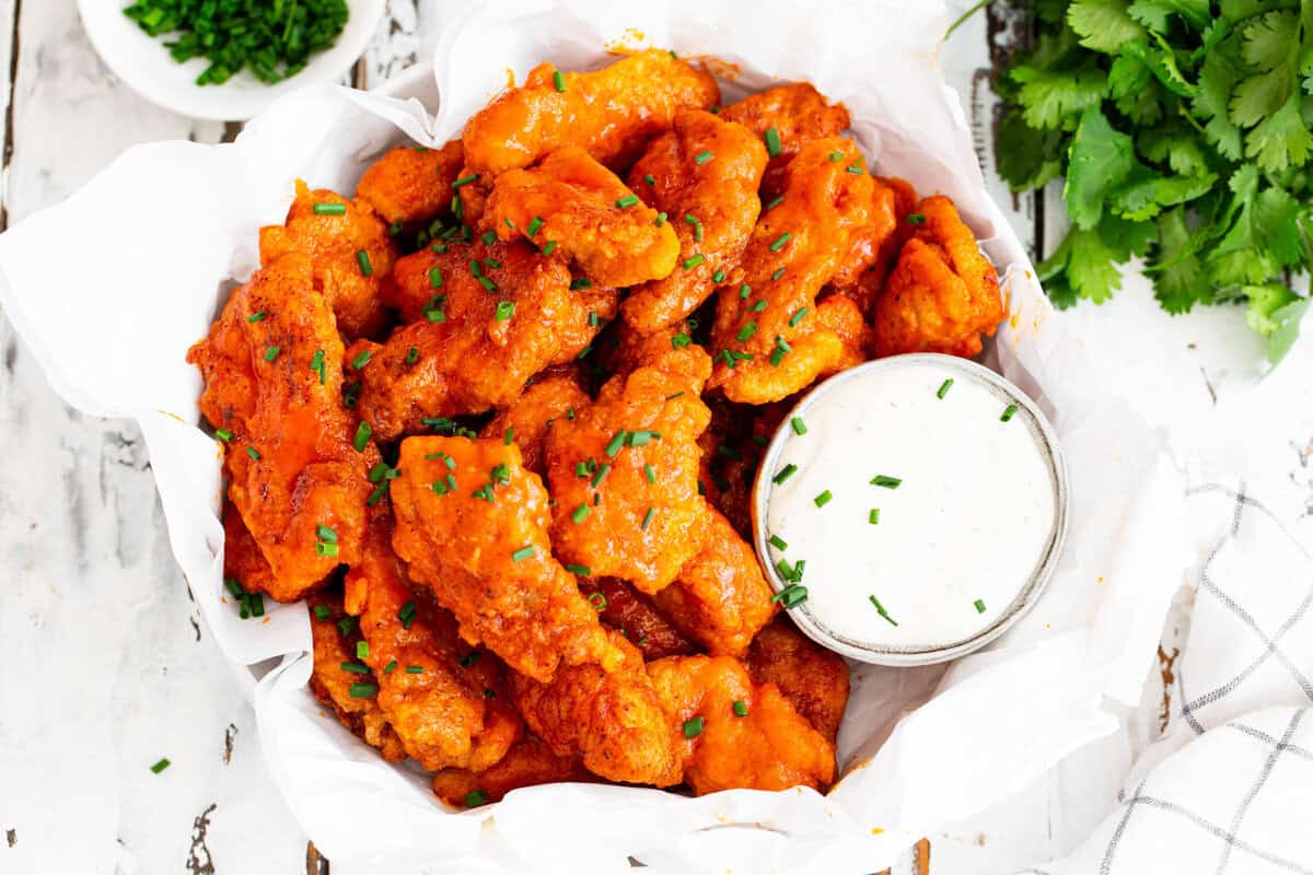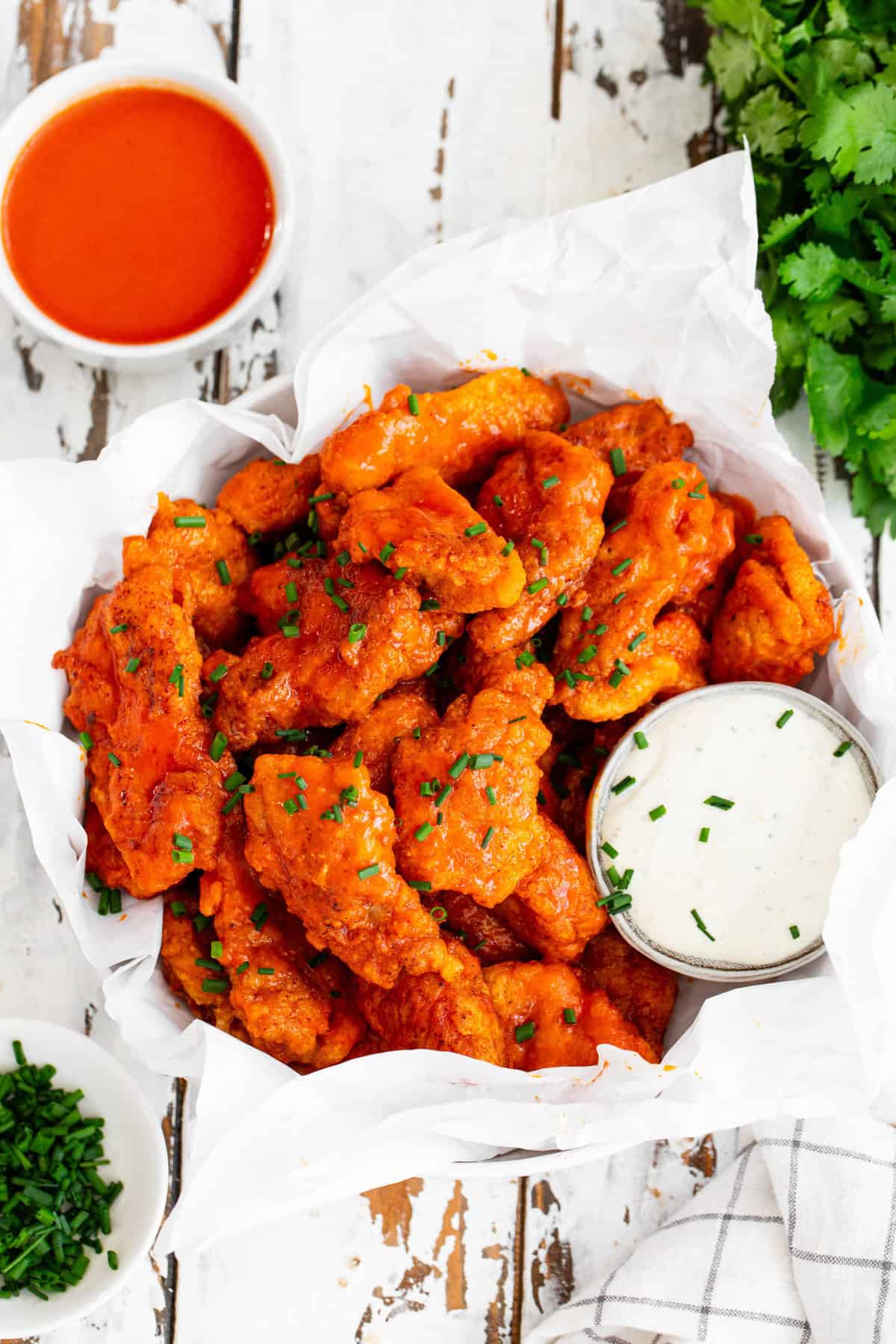These paleo boneless wings are ridiculously tasty and couldn’t be easier to make! Grain free, crispy and tossed in two ingredient buffalo sauce, then served with ranch, they’re perfect for game day, Super Bowl, parties or a fun dinner!
