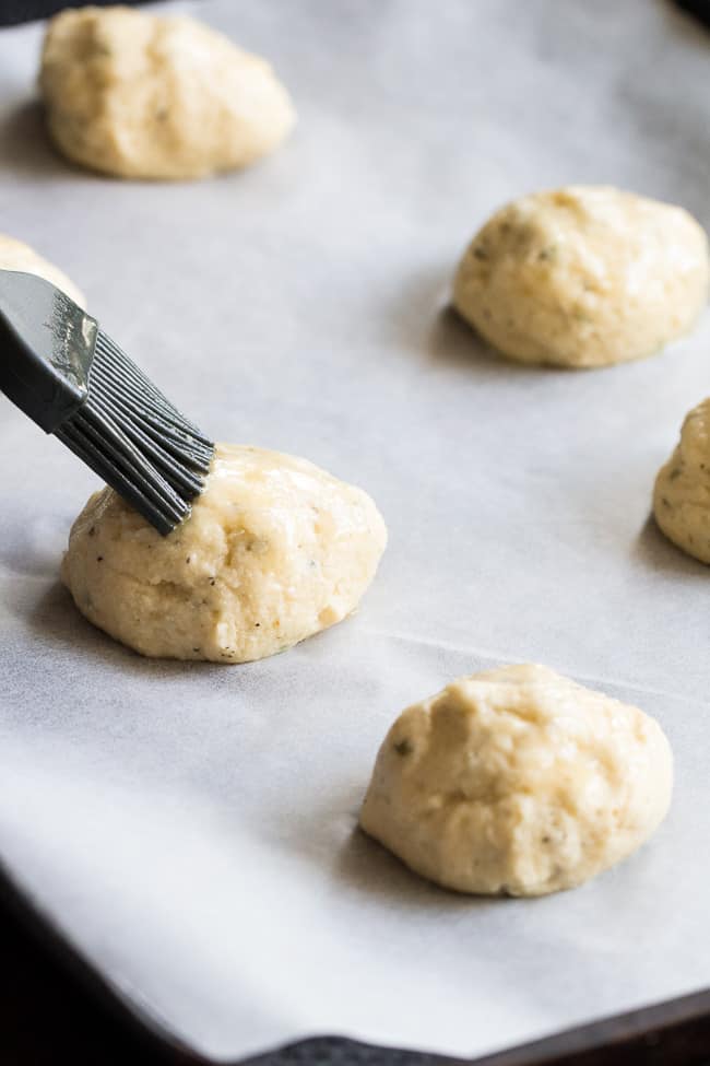 If the dough is still a bit sticky after allowing it to sit for a minute (mine was) wet your hands very lightly with a warm water, then carefully shape dough into 7 balls and place on prepared baking sheet. Lightly brush each roll with melted coconut oil or butter (or whatever you used)