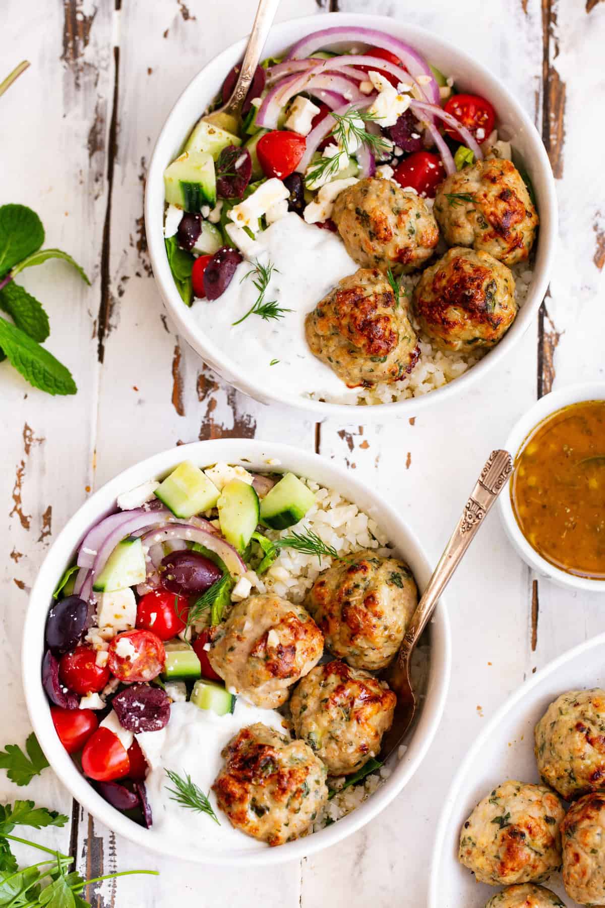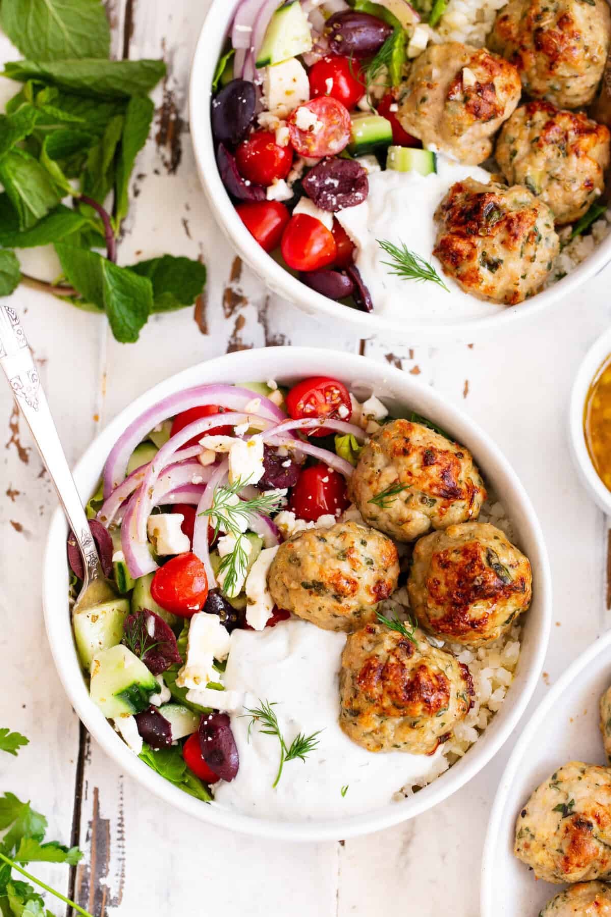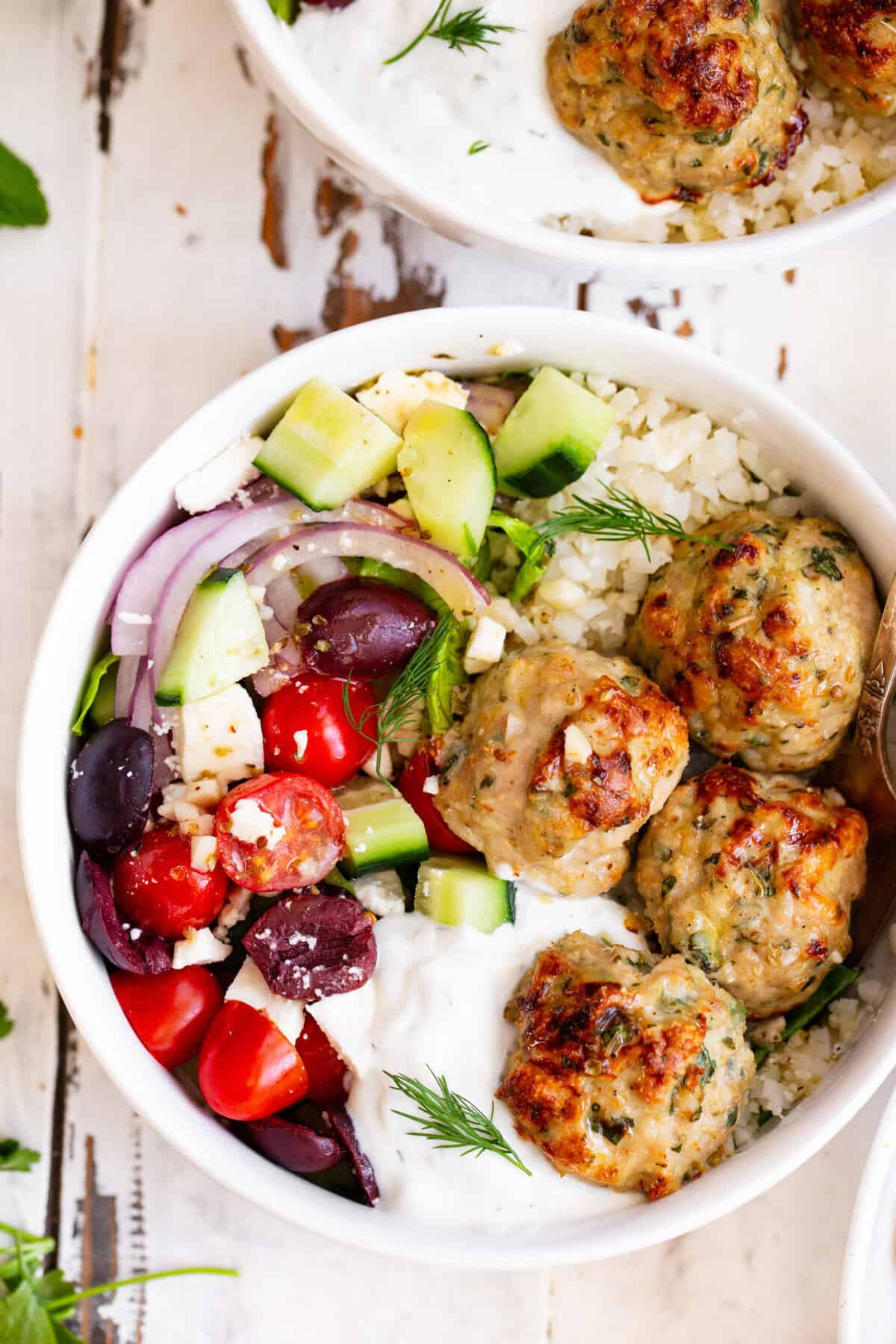 Greek Chicken Meatball Bowls {Paleo, Whole30, Keto}