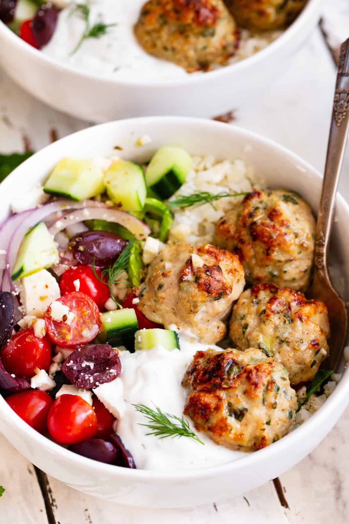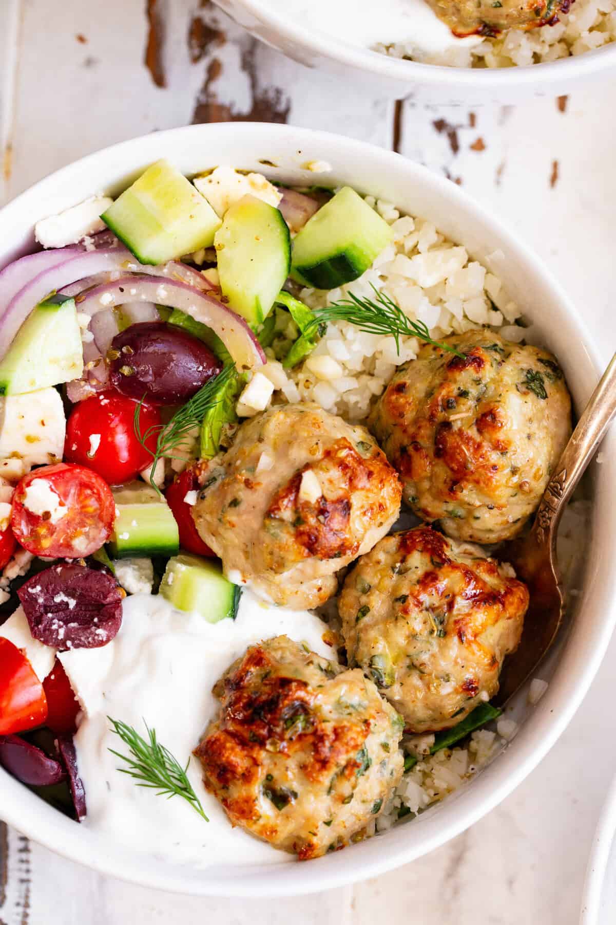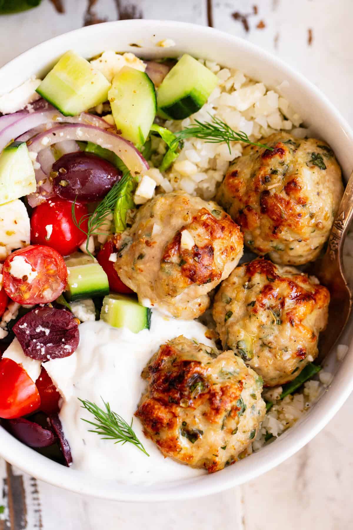 Greek Chicken Meatball Bowls {Paleo, Whole30, Keto}