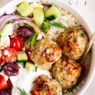 High in protein, grain free, low carb and paleo, these Greek chicken meatball bowls are loaded with flavor packed herby chicken meatballs, crisp veggies, and a zesty Mediterranean dressing. Simple, nourishing and filling, plus perfect for an easy weeknight meal or meal prep.