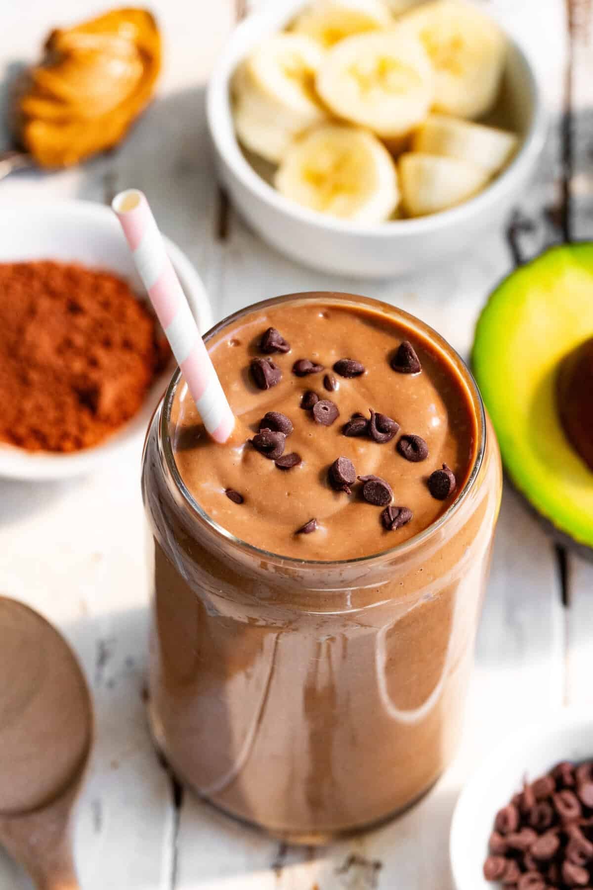 Avocado has a very mild flavor, so it doesn’t overpower the smoothie. In chocolate smoothies especially, you won’t taste it at all, it simply makes the texture richer and creamier.