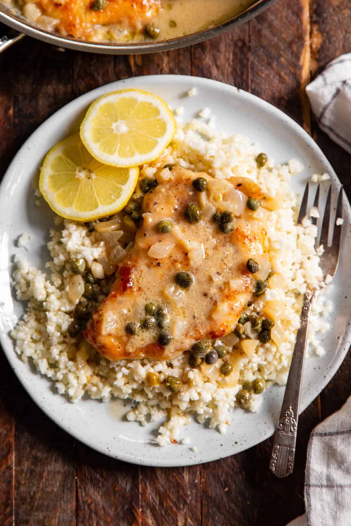 Cook for 3 more minutes, then stir in the coconut cream (or heavy cream) and the mustard (if using). Cook and stir another minute, then stir in the capers. Add the chicken back to the skillet, lower the heat to a simmer and simmer another minute. Serve over sautéed cauliflower rice or veggie noodles. Enjoy!