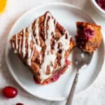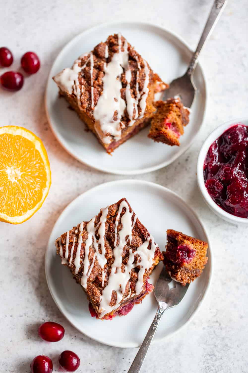 Since this Paleo coffee cake recipe contains a layer homemade cranberry sauce, I’d recommend storing it in the fridge for up to 4 days.