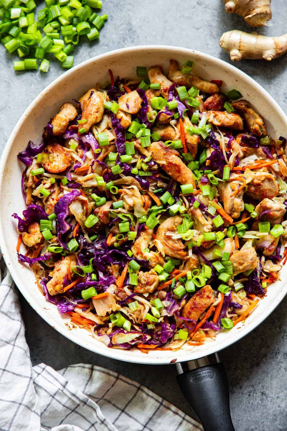 Made in one pan in about 20 minutes, this recipe has everything you love about classic egg rolls – savory ground chicken, cabbage, garlic, ginger, and a flavorful sauce – without the deep-fried wrapper.