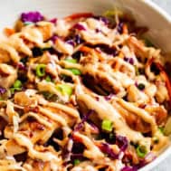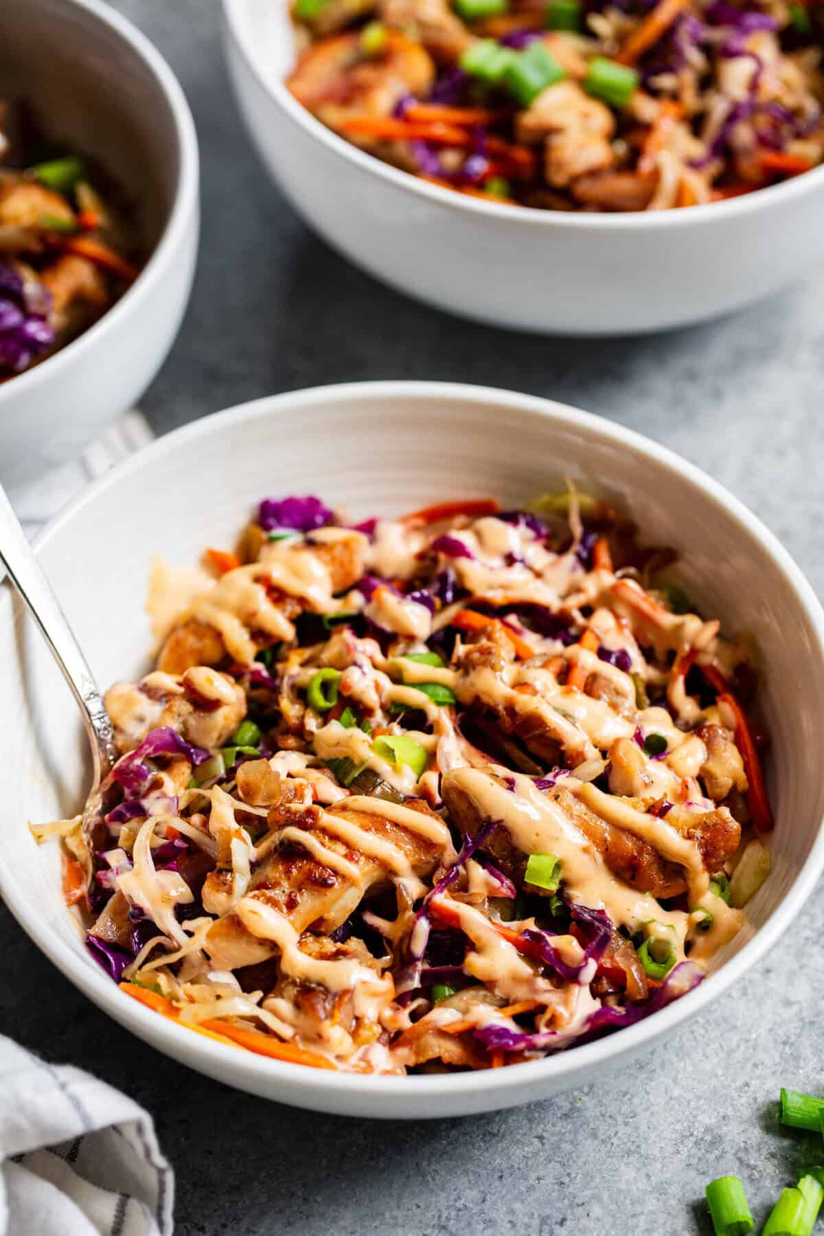 And wait, there’s another sauce too – to top your egg roll bowl! I couldn’t resist topping this one with a sesame aioli just like I did for the shrimp egg roll bowls.