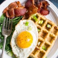 These savory bacon plantain paleo waffles are made with just 3 ingredients and couldn’t be easier. Perfect with your favorite greens and a crispy fried egg! Grain free, dairy free, paleo, delicious!